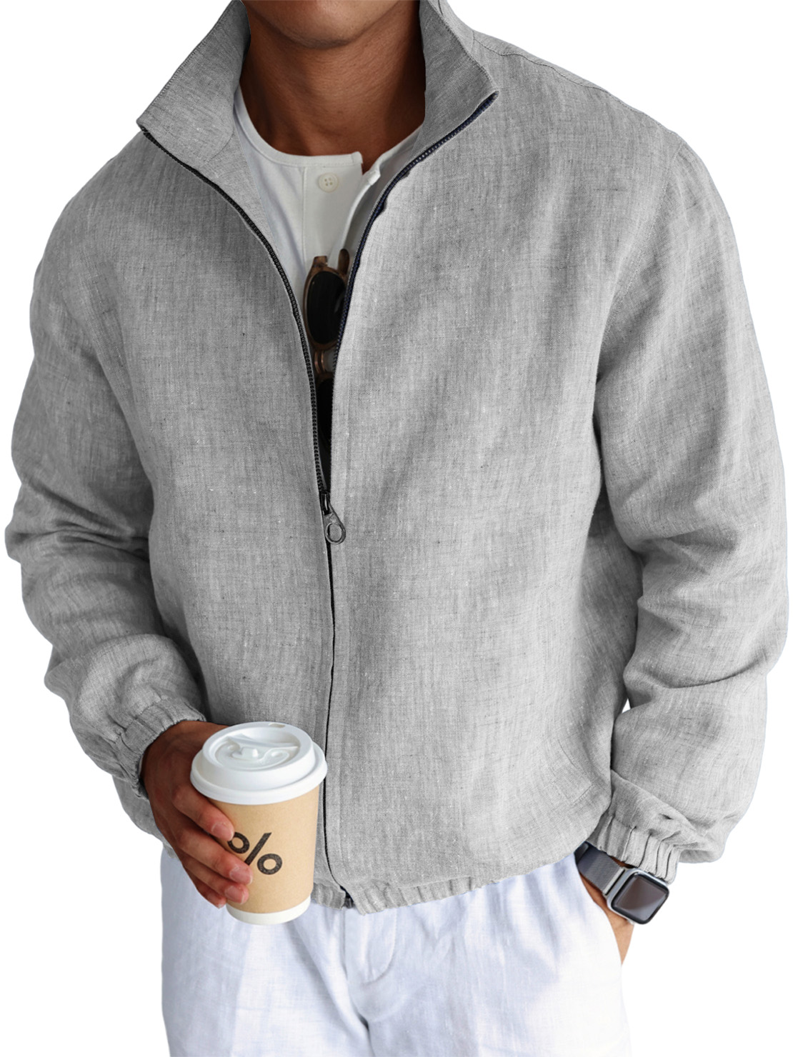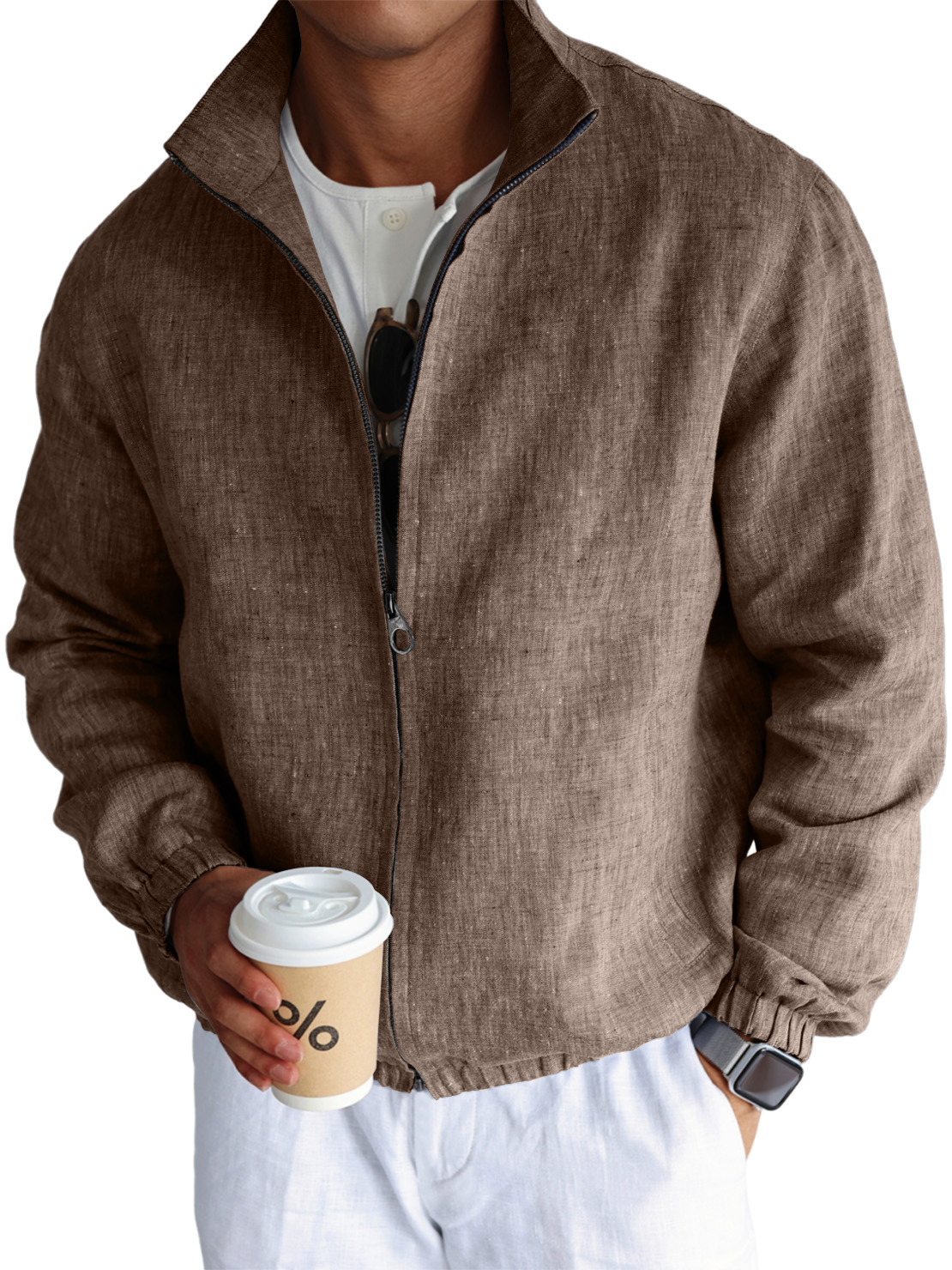 Men's Simple Casual Cotton And Linen Stand Collar Zipper Jacket