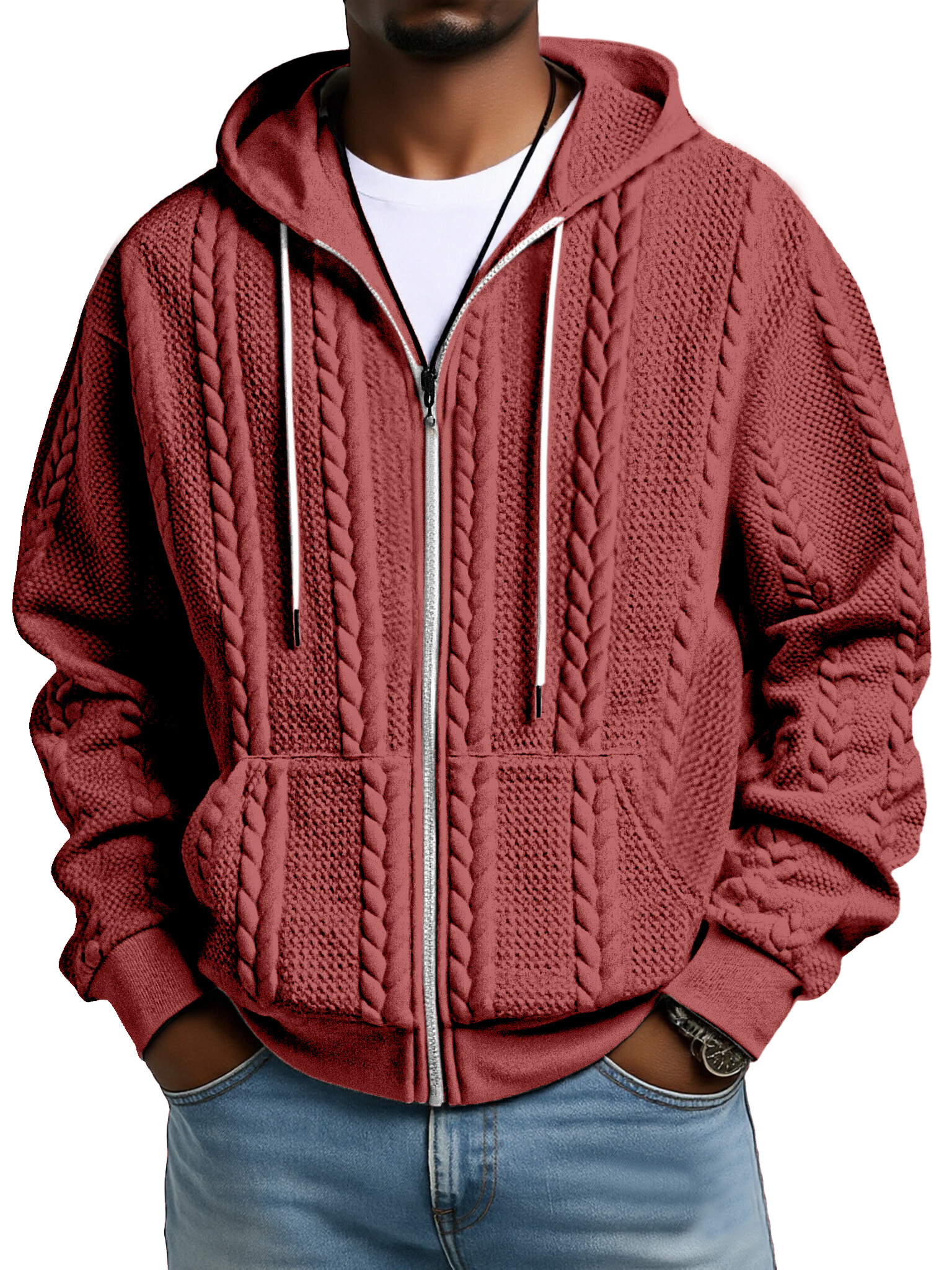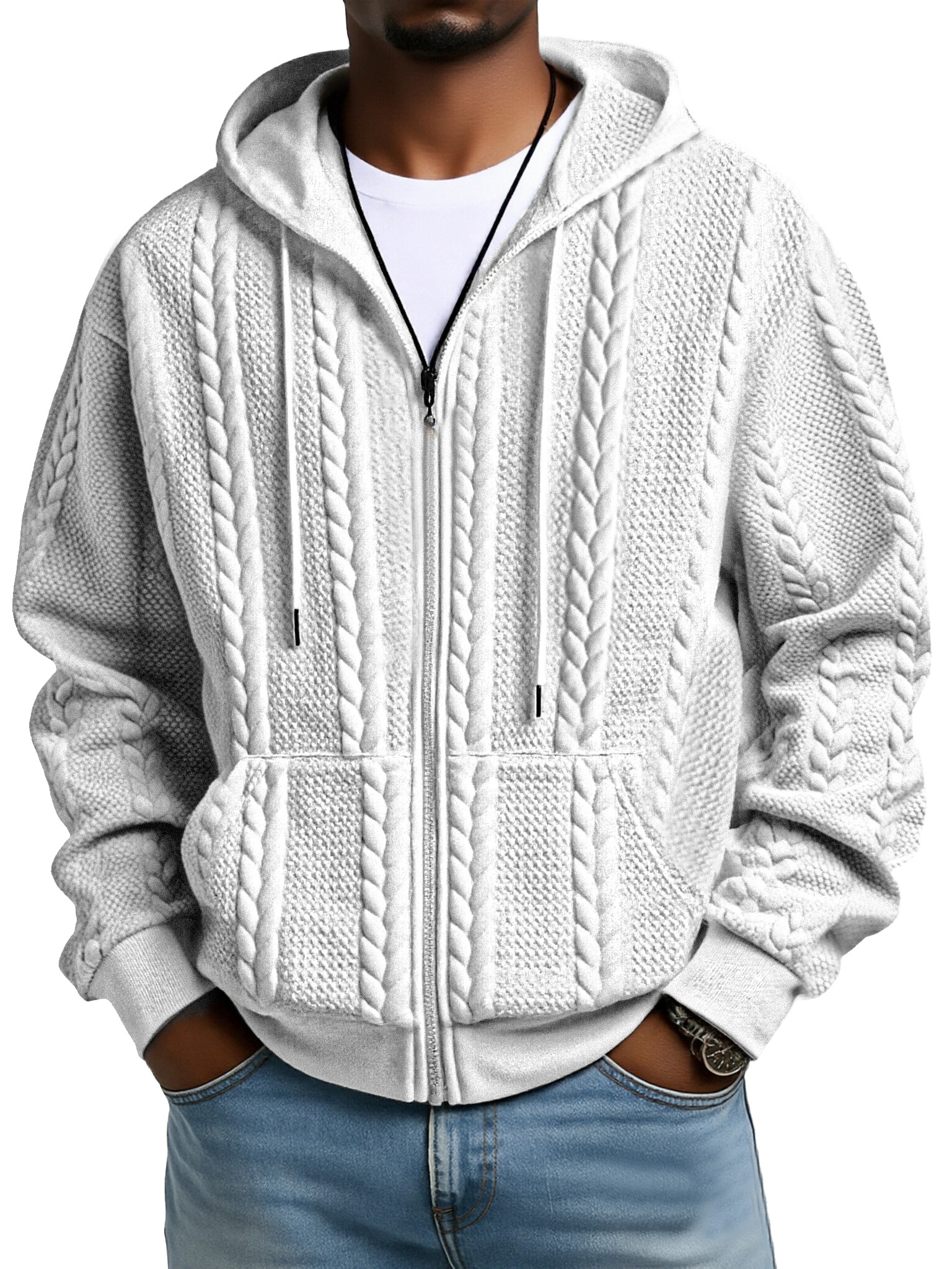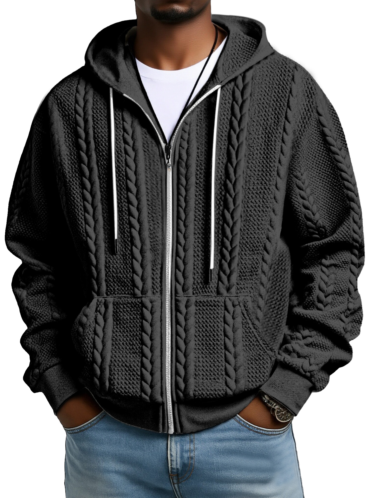 Fashionable Solid Color Twist Texture Hooded Zipper Sweatshirt Jacket