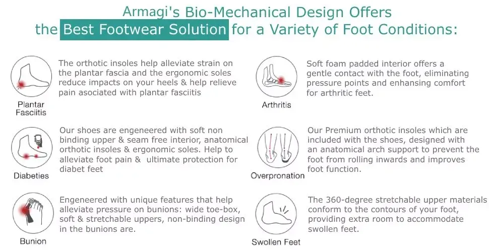 A wide & roomy TOE BOX along with an EXTRA DEPTH design offer a comfortable, non-binding fit for the front part of the foot and toes, and ease pressure on bunions, hammertoes, swollen feet.