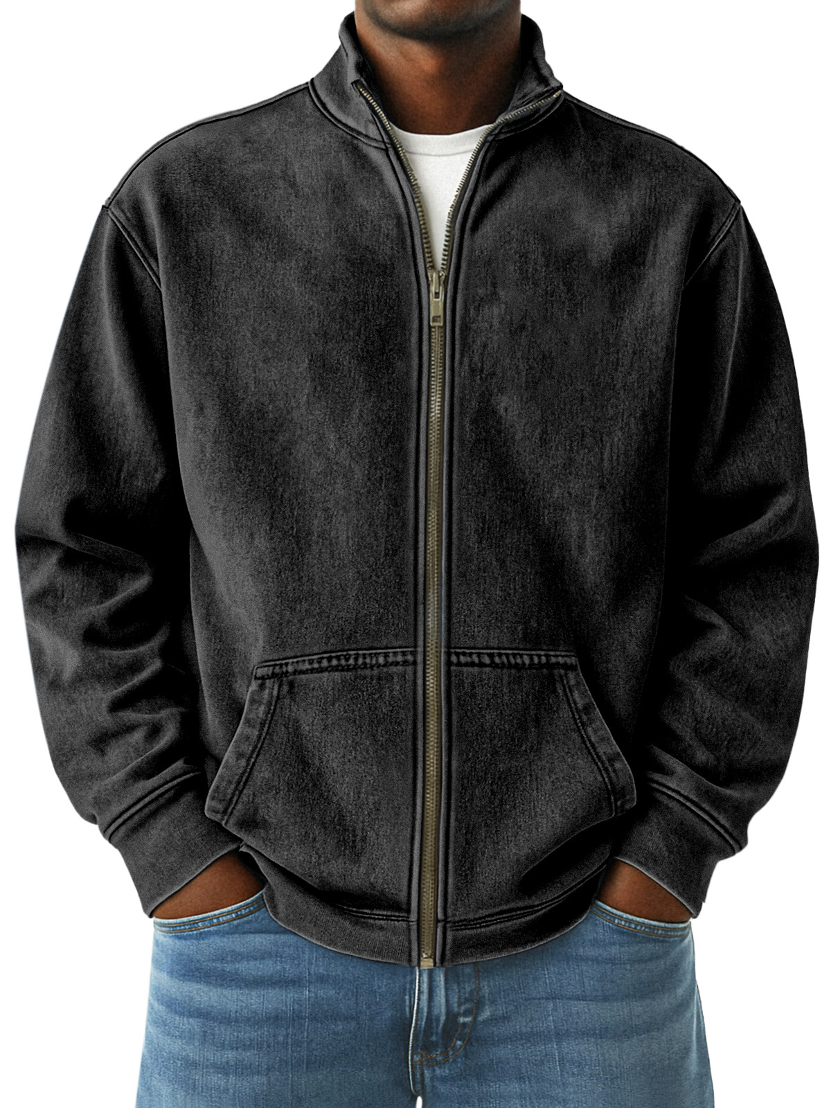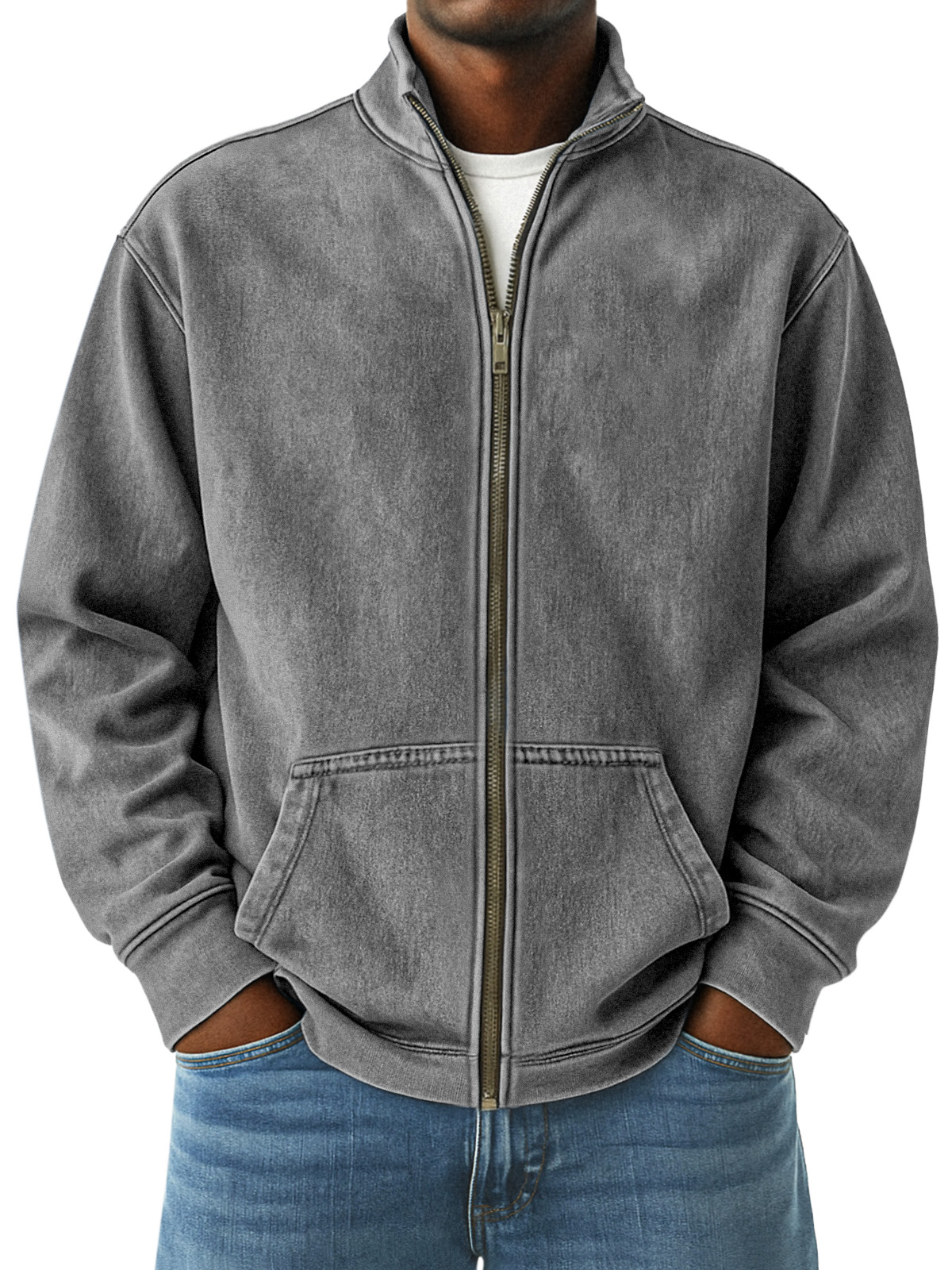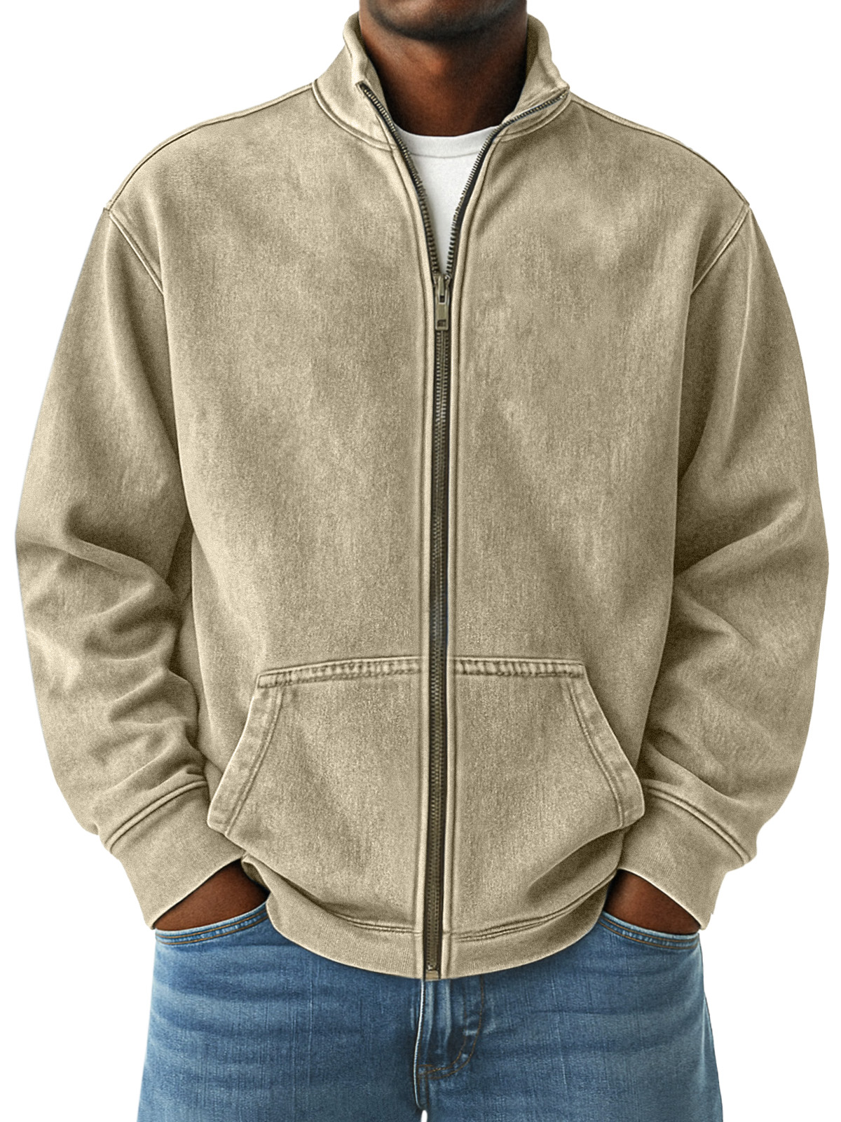 Retro Solid Color Stand Collar Kangaroo Pocket Zipper Jacket