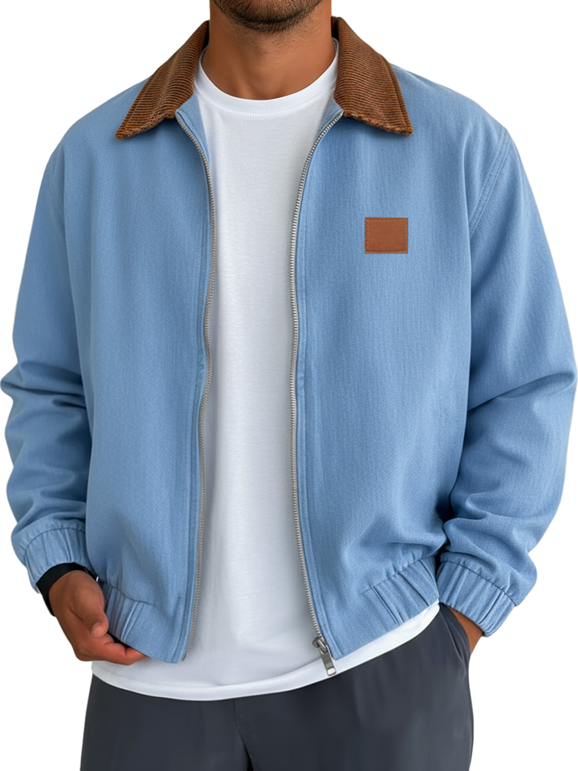 Men's Simple Solid Color Patchwork Collar Embroidered Leather Label Casual Jacket