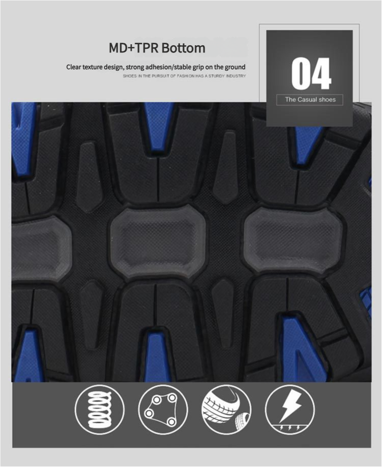 MD+TPR sole:The exquisite combination of MD material and TPR material lays a solid foundation for the sole. On top of it, the carefully carved texture is clearly visible, and every groove and every bulge has been scientifically laid out and designed. These textures are like the veins of the earth, deeply embedded in the ground, greatly improving the adhesion of the sole.